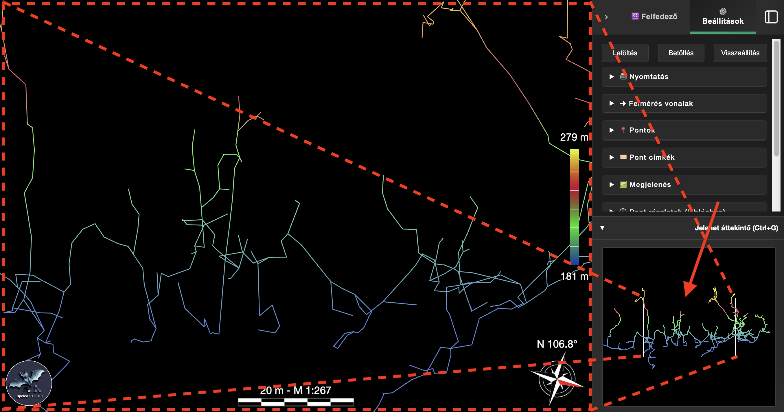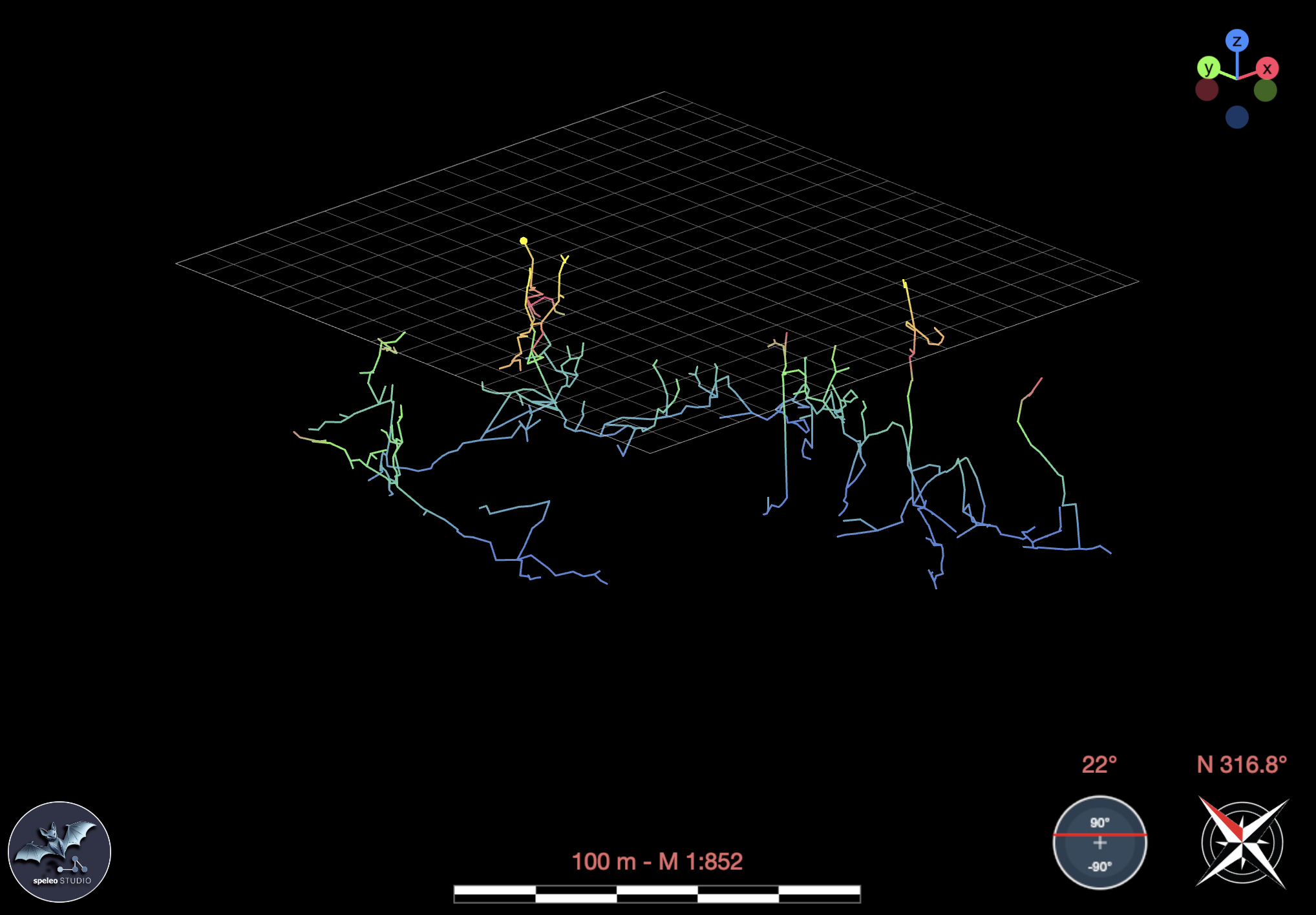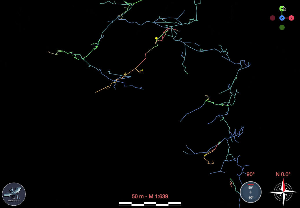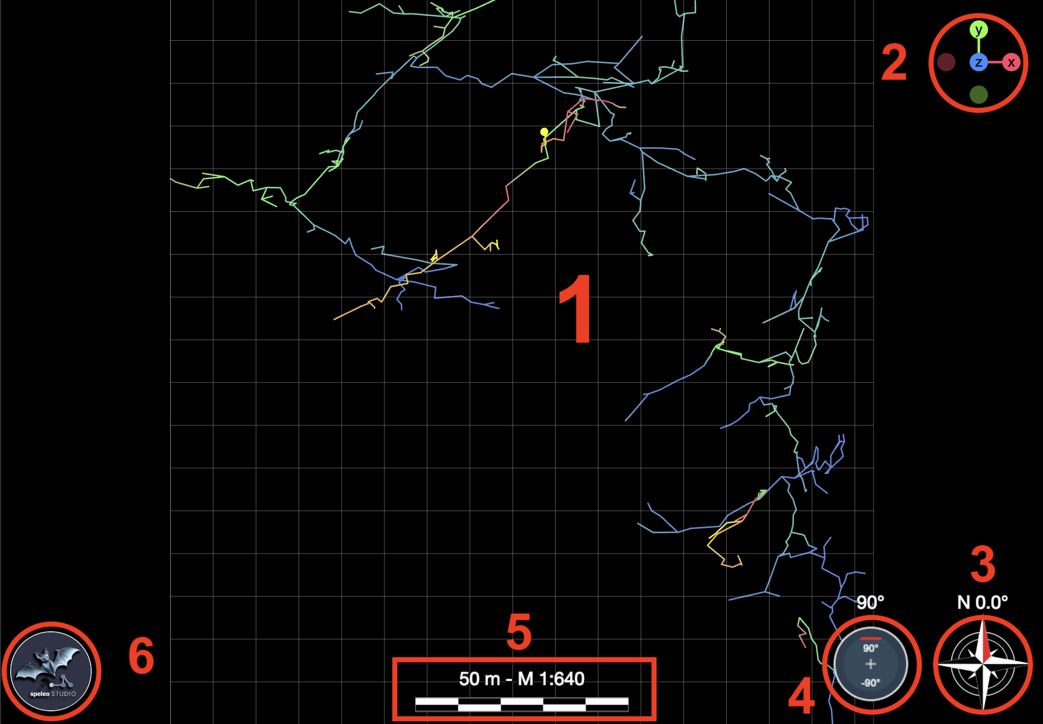 A 3D viewport a Speleo Studio központi területe, ahol a barlangrendszerek 3D-s megjelenítése és navigálása történik. Ha megnyitjuk az alkalmazást, akkor ez a nézet jelenik meg. Itt jelennek meg a felmérési adatok, az egér és a billentyűzet segítségével navigálhatunk a jelenetben és használhatjuk a vizualizációs eszközöket.