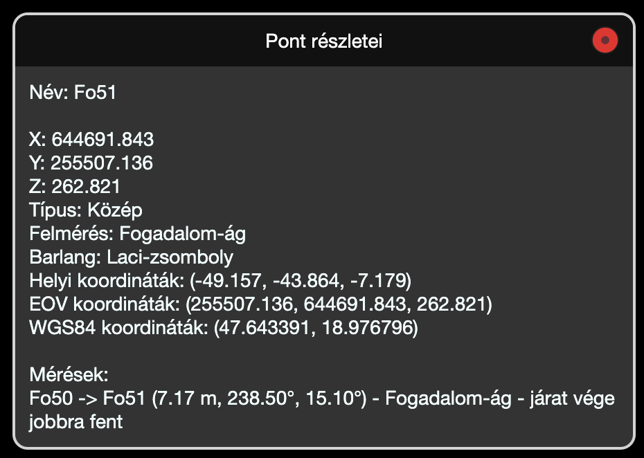 A pont kiválasztás lehetővé teszi az egér mozgatásával a barlangok és felszíni objektumok pontjainak a kiválasztását. Kattintás nélkül egy pont fölé húzva az egeret az egér mutatóra változik és egy piros kör jelenik meg a pont felett, valamint az adott pont részletei jelennek még a láblécben. Kattintás hatására pedig egy felugró kontextus menüből választhatunk opciókat (pl. távolság mérés).