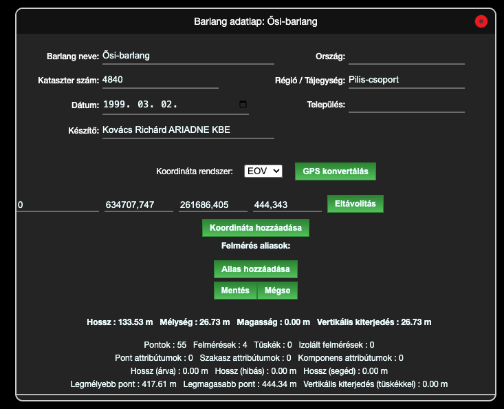 Az adatlap tartalmazza a barlang alapvető információit: