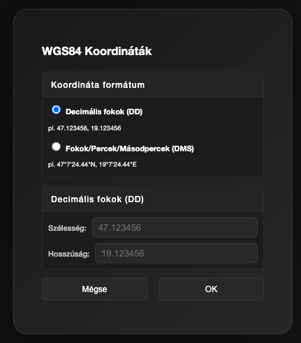 Lehetőség van GPS (WGS84) koordináták manuális megadására is, amelyeket a Speleo Studio automatikusan UTM koordinátákra konvertál. A GPS konvertálás gombra kattintva megadhatjuk a GPS koordinátákat (hosszúság és szélesség) kétféle formátumban: fokok és percek (DMS) illetve decimális fokok (DD). A megadott koordinátákat a Speleo Studio UTM koordinátákra konvertálja a megfelelő UTM zóna kiválasztásával és felveszi a koordinátákat a barlang adatlapján. Ne felejtsük el megadni a kezdőpont nevét, illetve magasságát!