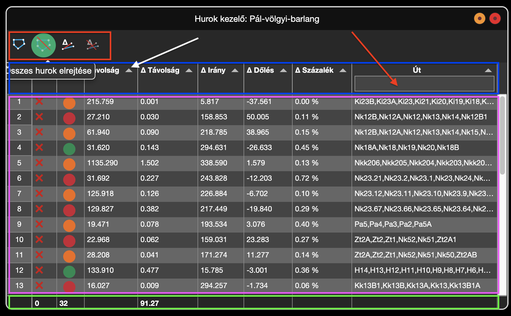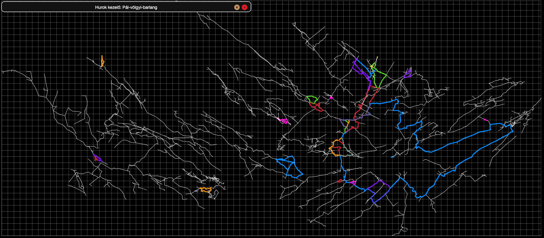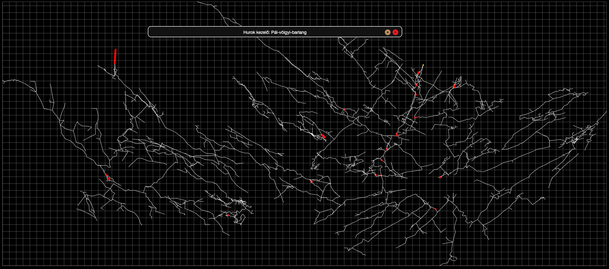 A következő képen a Pál-völgyi-barlangban található hurk hibák láthatóak piros vonallal, amelyeket a harmadik ikonnal jelöltünk meg.