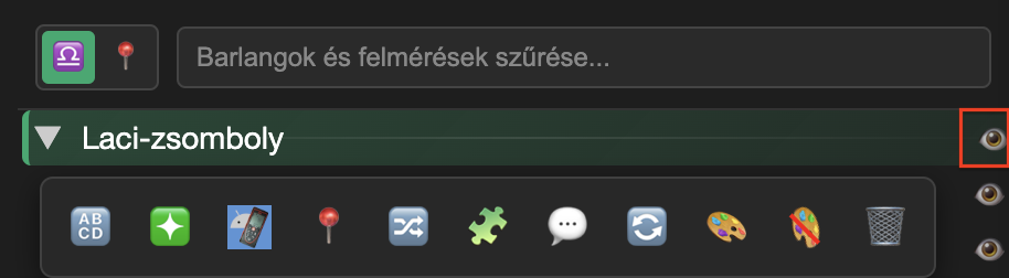 A barlang szerkesztéséhez az oldalsávban nyissa meg a Felfedező panelt, majd kattintson a barlang nevére, ekkor az adott barlang ikon sávja jelenik meg. Az ikonok funkciói: