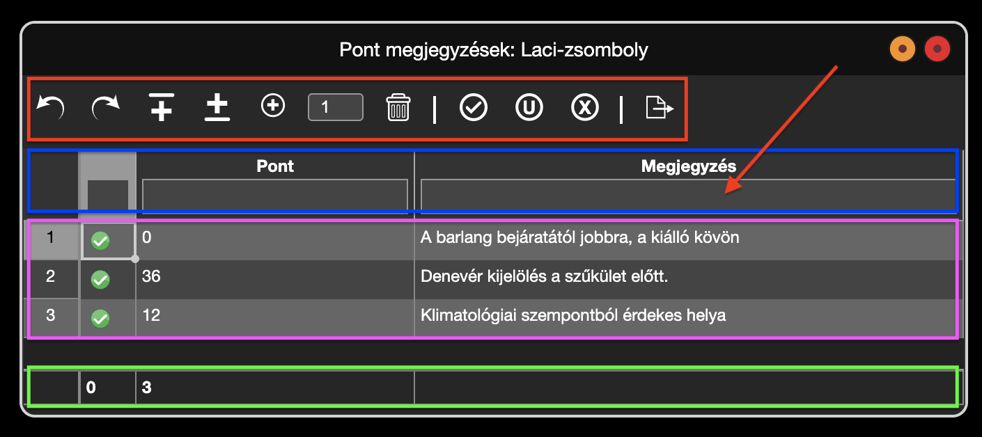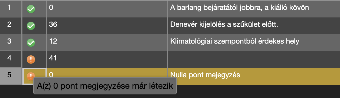 A Speleo Studio a validálás vagy a frissítés gombra kattintva ellenőrzi az adatok helyességét. Ha a pont megjegyzések nem helyesek, akkor a státusz oszlopban narancssárga ikon jelenik meg, amelyre kattinva a hiba részletes leírását kapjuk meg. A frissítése során hibás sorok is elmentődnek.