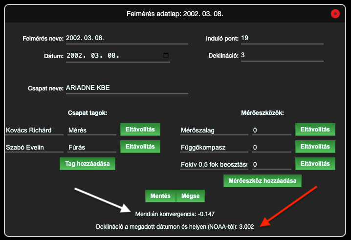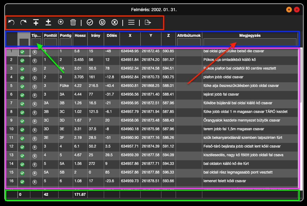 | Státusz | Típus | Ponttól | Pontig | Irány | Dőlés | Hossz | Attribútumok | Megjegyzés |