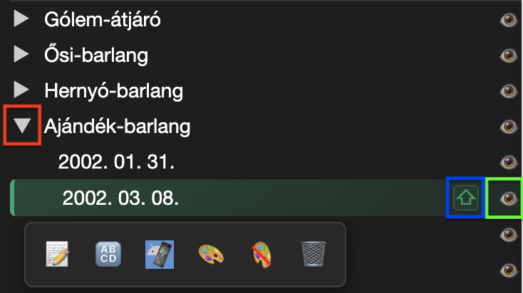 A felmérés szerkesztéséhez az oldalsávban nyissa meg a Felfedező panelt, majd nyissa ki a felmérést tartalmazó barlang felméréseinek listáját a barlang neve melletti háromszögre kattinva (az ábrán piros keret). A lenyílő listában kattintson a felmérés nevére, ekkor az adott felmérés ikon sávja jelenik meg. Az ikonok funkciói: