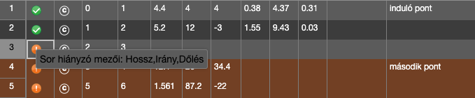 A Speleo Studio a validálás vagy a mérés frissítés gombra kattintva ellenőrzi a felmérési adatok helyességét és integritását. Ha a mérési adatok nem helyesek, akkor a státusz oszlopban narancssárga ikon jelenik meg, amelyre kattinva a hiba részletes leírását kapjuk meg. A mérés frissítése során hibás sorok is elmentődnek, ugyanakkor a hibás sorokat a Speleo Studio nem használja fel a középvonal (poligon) számításánál.