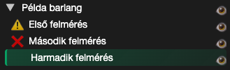 Az érvénytelen - hibás mérések kihatnak nemcsak az adott mérésre, hanem más mérésekre is. Ha egy felmérésben egy mérés hibás és a kezdő vagy végpont hivatkozva van más mérésekben, akkor a hibás mérés hatással lehet ezekre a mérésekre. Ez eredményezheti azt, hogy az érintett felmérések minden mérése árva mérés lesz és a felmérés egyetlen mérése sem csatlakozik korábbi középvonalhoz (poligonhoz). A Speleo Studio a mérés frissítésekor ellenőrzi a felmérés integritását és jelzi a hibákat a Felfedezőben. A felmérés neve mellett figyelmeztető ikon jelenik meg, ha hibás - érvénytelen mérések vannak a felmérésben, piros X pedig a nem csatlakozó, árva mérések jelzésére szolgál. Az ábrán az első felmérés hibás méréseket tartalmaz, a második felmérés pedig árva.
