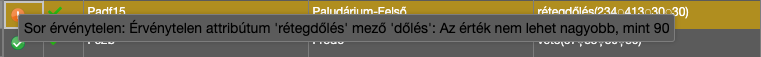 A Speleo Studio hasonlóan a többi szerkesztőhöz ellenőrzi az attribútumok paramétereinek helyességét a megfelelő adat konzisztencia érdekében. Minden validálási szabályt megtalálunk az Attribútum referencia oldalon. A hibás attribútumokat a státusz oszlopban narancssárga ikon jelenik meg, amelyre kattinva a hiba részletes leírását kapjuk meg.