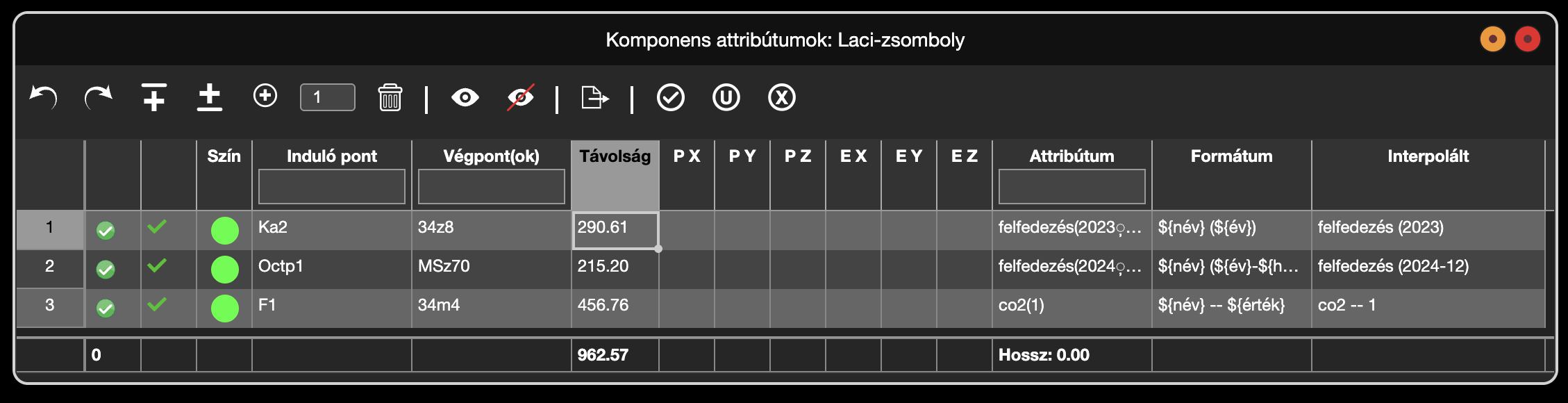 A pont attribútum ikonra kattinva megnyílik a szerkesztő ablak az attribútumok táblázatos megjelenítésével.