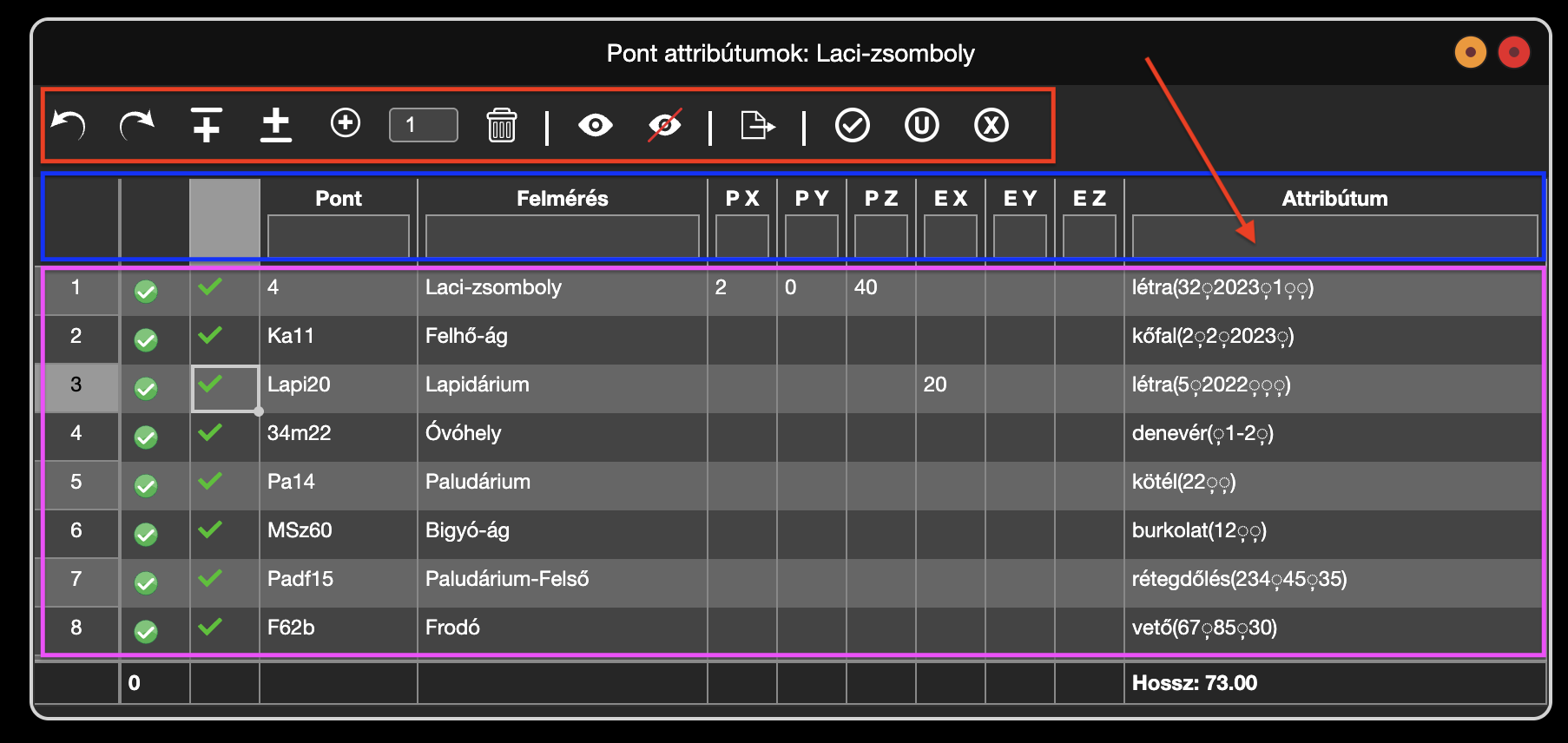 Az attribútumok segítségével plusz tulajdonságokat, információkat vehetünk fel a barlang egy adott pontjához, szakaszához vagy részéhez és azokat térben is megjeleníthetjük. Az attribútumok részletes ismertetése az Adatmodell és struktúra oldalon található, ebben a fejezetben a szerkesztésüket mutatjuk be.