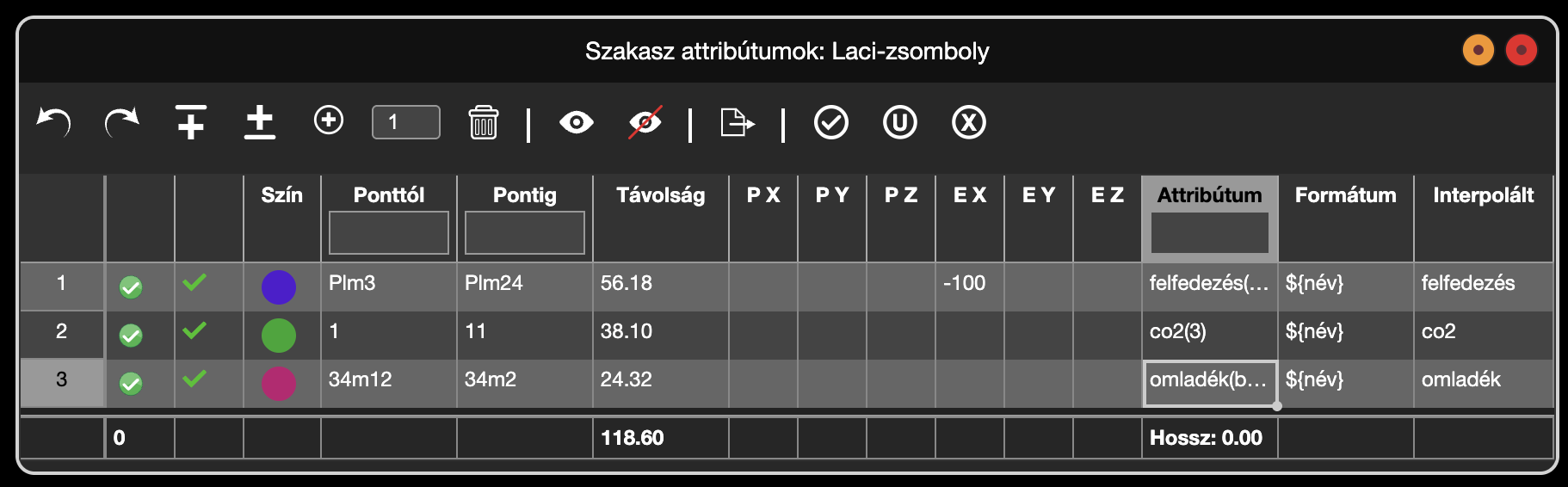 A szakasz attribútum ikonra kattinva megnyílik a szerkesztő ablak az attribútumok táblázatos megjelenítésével.
