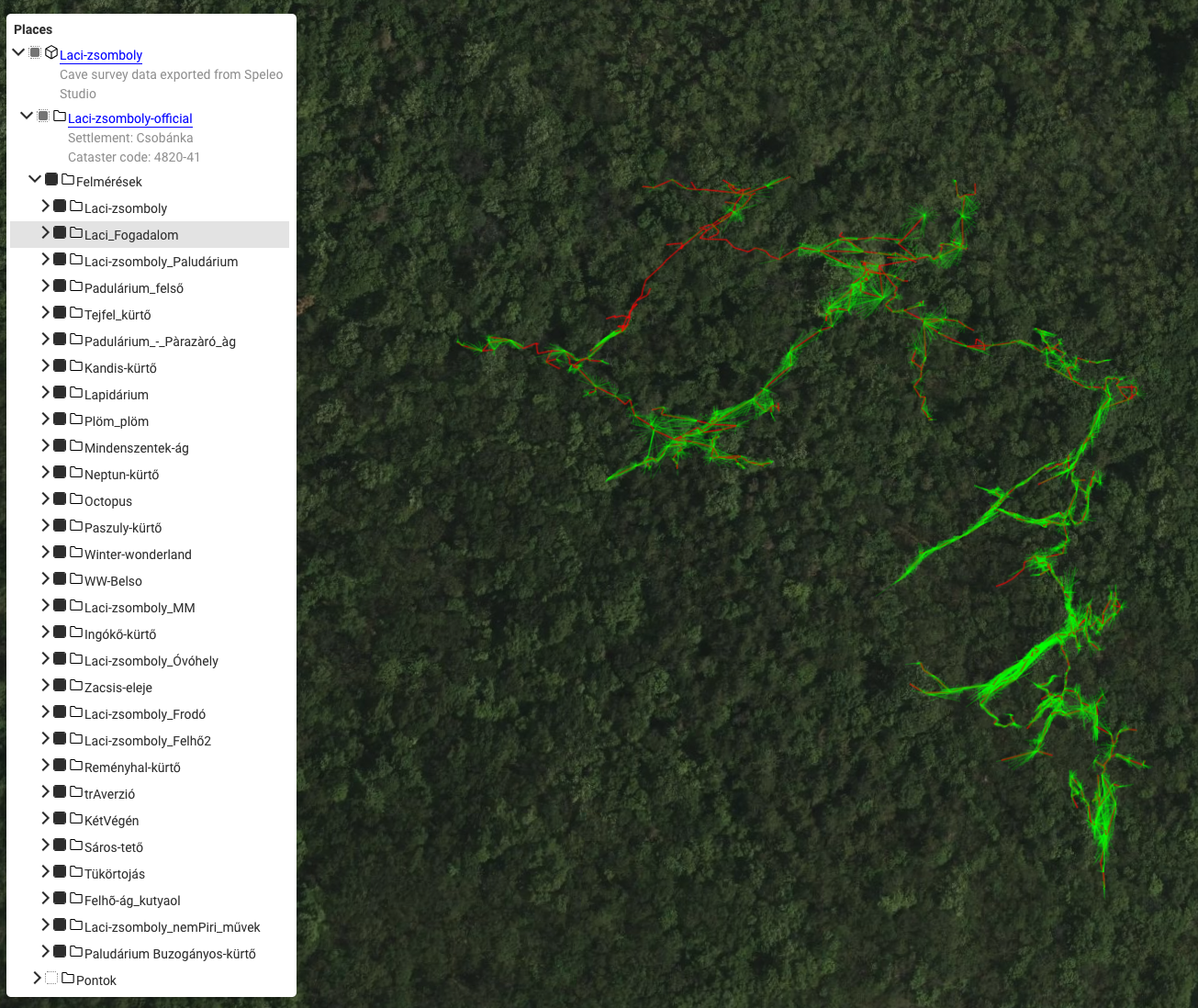 A Laci-zsomboly KML kimenetének megjelenítése különböző rétegekkel és tüskékkel egy KML nézegető weboldalon.