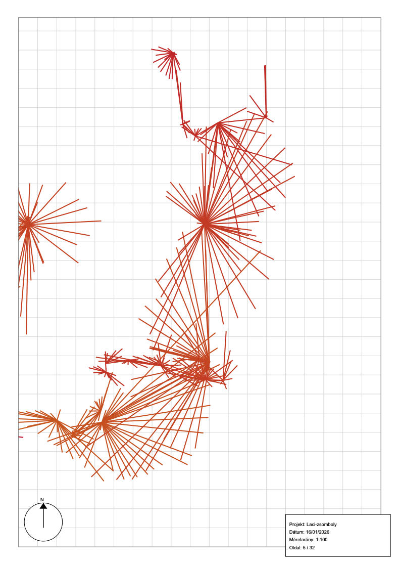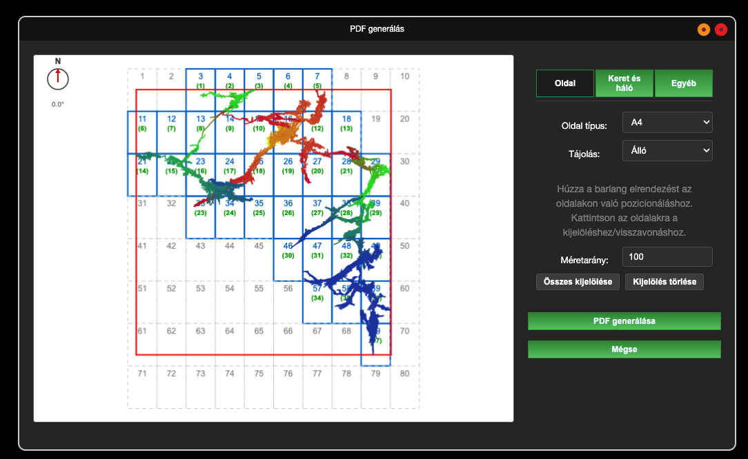 Kattintson a "Generálás" gombra a PDF generálásához. A generált PDF fájl letöltésre kerül a böngészőben. A fájl első oldalán egy áttekintőt talál, majd a térkép lapjai következnek. A keretben megjelenő szöveg mellett egy iránytű segéd is látszik.